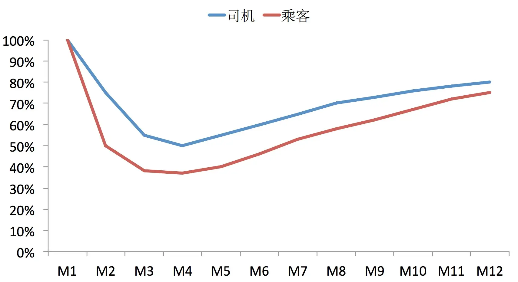 举个例子来解释。Uber 新进入一个城市以后,司机端和乘客端的留存大概是这样的:
