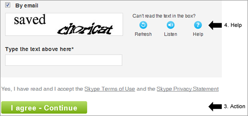 Skype的注册表单包含了用户触发帮助(上方通过点击问题标识触发的蓝色框)以及自动帮助(建议的用户名)