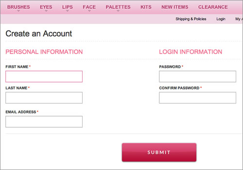 (表单不应包含多列。以Makeup Geek的页面为例,很容易就忽视了右边纵列信息(更别说“必填项”注释在尾部))。
