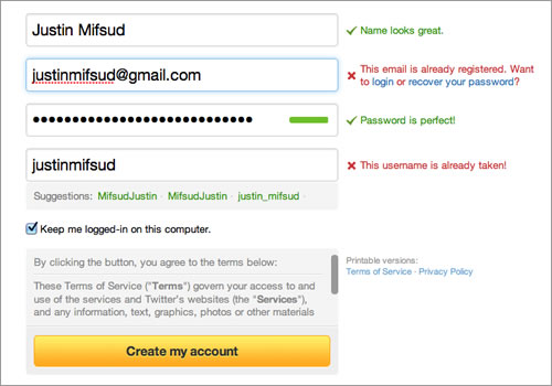 Twitter的注册表单使用了自动确认(针对姓名,邮件地址,密码和用户名)以及智能默认值(“保持登录状态”)。