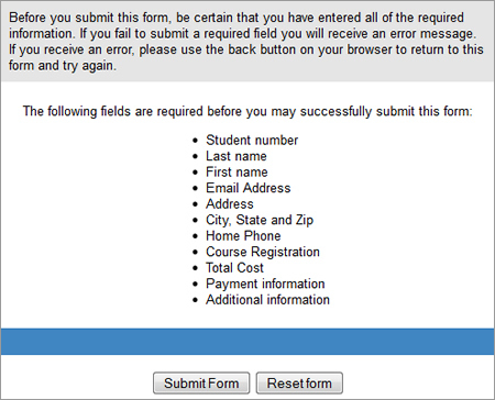 缺乏明显区别的主次行为会导致失败。看看在St. Louis Community College站点冗长的登记注册表单上的按钮,想象一下万一误操作点了“重设表单”……