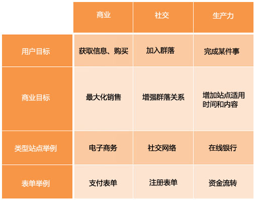 让我们通过讨论表单使用的三大主要方式来解释这个观点。就像Luke Wroblewski在他书中(Web Form Design: Filling in the Blanks网络表单设计:填补空白)所陈述的,每个表单都因三大主要原因中的某个要素而存在:商业,社交或者生产力。以下表格将这些要素转换成了原因背后的用户/商业目标: