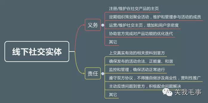从上图可以看出,社交实体作为活动运营的最主要部分,必须确保活动的合法性、正能量以及可参与性;同时肩负管理成员、社区等义务。