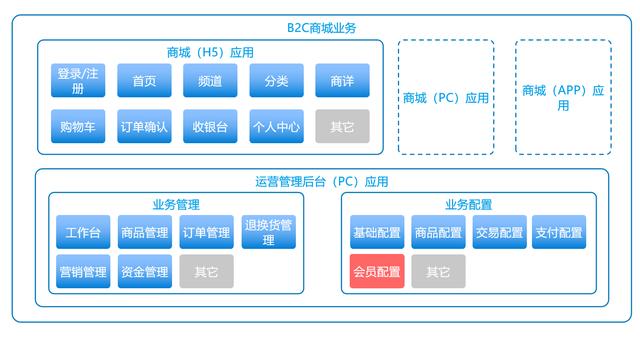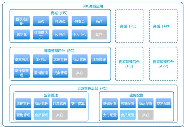 而在业务架构下我们电商业务又是怎样的,我们分别看下BBC、B2C商城是怎样的,如图: