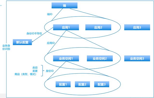 而在端到业务应用之间最为关键的就是如何进行业务身份识别。业务身份不同的影响因素主要有:行业(不同的类目)、卖家、和商品(不同的类型、模式),我们在设计业务身份时首先需要明确这个业务身份是在那个租户下,其次需要把对应的应用关联到业务空间,关联的应用决定了在该业务空间能够设置的配置项的范围,然后我们可以对我们这个业务空间进行四个因素的选择。