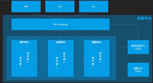 而且分系统最终的目的是能够以更小粒度调配人力、物力、财力去完成系统的开发工作,而更小粒度的团队也更加便于管理,有效的降低企业成本。狭义的中台也是一种软件架构(如图),面向消费者的是各种端中的应用,通过统一的API网关能够使用中台各个业务中心的业务能力,而各个中心之间也能通过统一的协议进行调用。
