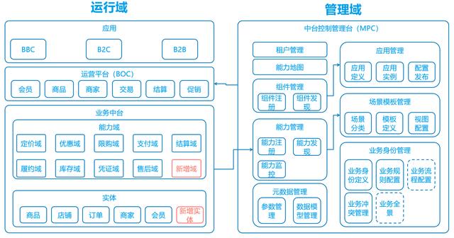 在上文所说的页面、功能、能力、数据模型都是属于运行域的内容,而由于这些内容在随着企业业务不断的发展过程中会越来越丰富,所以我们需要提供一个工具来对这些内容进行管理,随之管理域就出现了。如图基于中台的整体应用架构: