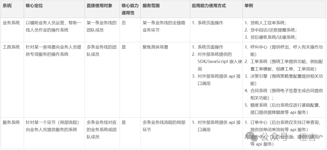 - 工具类系统,针对于特定场景,外部的业务系统将工具拿来即用,不存在流程or业务路径依赖;例如呼叫中心的呼叫面板、合同系统的电子签等等工具可拿来即用。