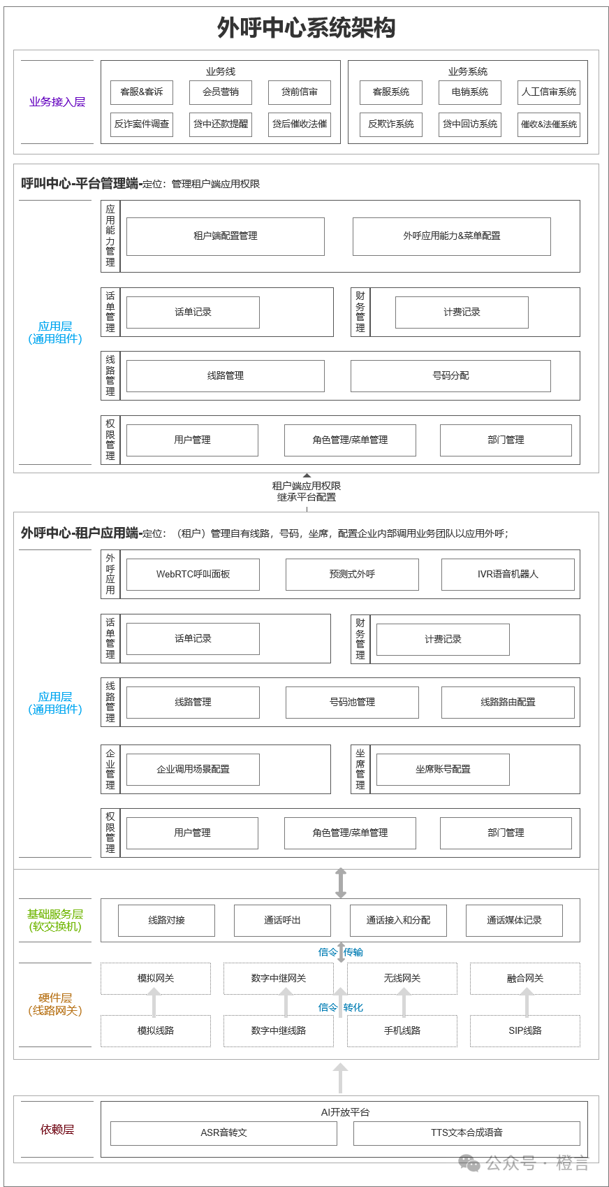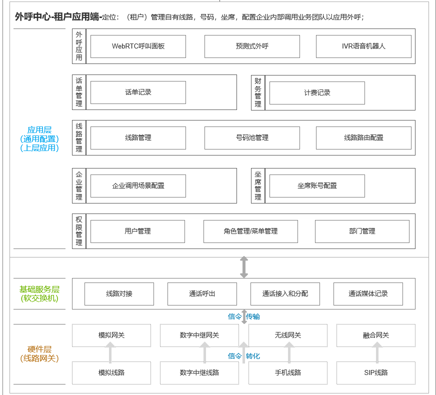 外呼中心相对比较特殊,需要由特定的硬件去实现基础能力的支撑,所以相对常规系统多了一个硬件层体现信息流;由于软交互机在通讯领域是一个很复杂且相对成熟的硬件,这里就不做展开说明。在整个系统架构设计之前,首要了解的就是呼叫中心最底层能提供什么样的基础能力。否则,上层应用的建设就是没有支撑的空谈。