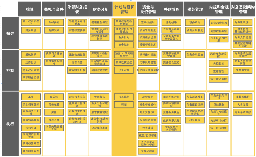 下面着重以核算、关账与合并、财务分析、内控与合规等几个方面阐述它们的指导、控制与执行。