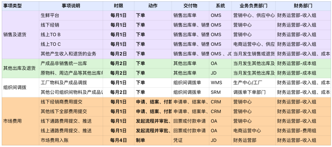 有些企业账期按自然月,关账从次月1号0点开始,并规定每个业务节点由谁或哪个部门来、在几号完成具体某个具体事项,示例如下图(有兴趣的同学可见:财务月结的那点事):