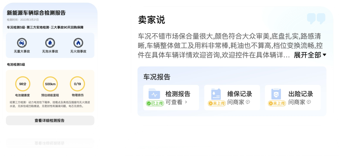 传统文字报告存在信息密度高、关键结论隐蔽等问题,导致用户获取车况信息的效率低下。可视化方案通过将文字报告转化为直观的可视化展示,显著降低信息理解成本:一方面,采用标签化方式呈现关键结论,如新能源车辆综合检测报告中突出显示“电池检测S级”“车况检测S级”“第三方实地检测”“三大事故90天回购保障”等核心信息,并明确标注检测时间(如2023年3月21日)及“无重大事故、无泡水事故、无火烧事故”等关键判定结果,帮助用户快速定位核心车况结论;另一方面,通过图表化呈现电池数据,如“电池健康度98分”“预估续航里程500km”等量化指标,将抽象数据转化为直观可感知的信息,进一步提升信息获取效率。