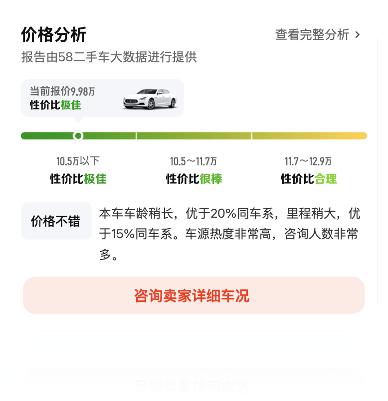 为帮助用户快速定位价格区间,模块创新采用动态进度条设计,通过颜色与区间划分直观呈现车辆价格水平。具体而言,进度条将价格分为“性价比极佳”、“性价比很棒”、“性价比合理”等五个区间,用户可通过颜色差异快速识别当前报价所处位置。以实际案例为例,当前车辆报价9.98万,处于“性价比极佳”区间,系统同步提供量化分析:“本车车龄稍长,优于20%同车系,里程稍大,优于15%同车系。车源热度非常高,咨询人数非常多”,通过同车系对比数据与市场热度信息,进一步增强价格透明度,使用户能够从多维度验证报价合理性。