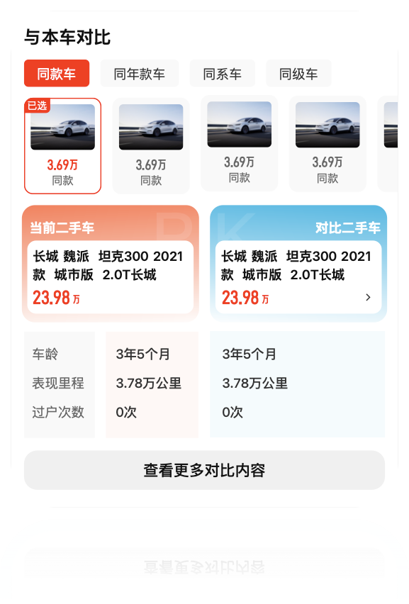 为进一步辅助用户综合判断性价比,该功能同步整合了配置对比模块,提供参数化信息展示。具体而言,对比内容涵盖车龄、过户次数、表显里程等核心车况参数,以及发动机类型、变速箱形式、车身尺寸等关键性能参数。