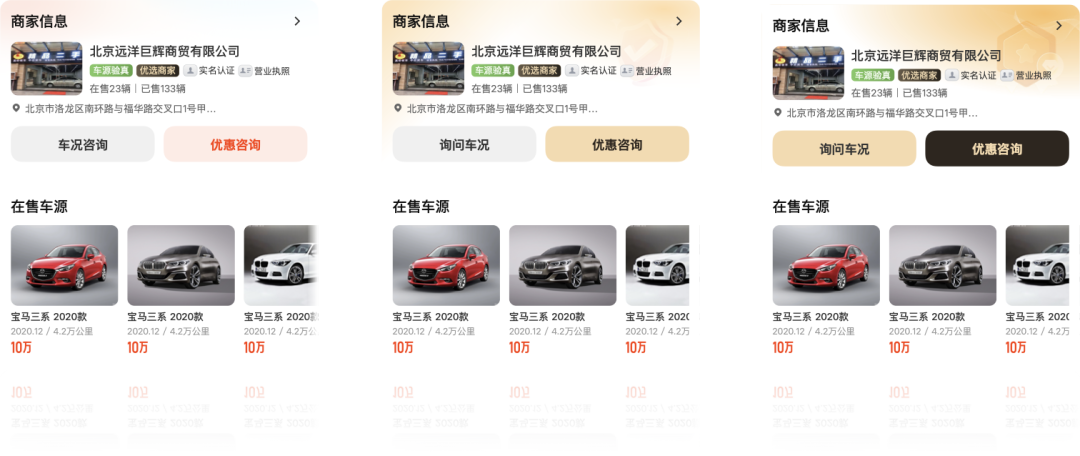 此外,平台对不同品质商家采用差异化展示设计,通过信息层级与视觉权重的区分,帮助用户快速筛选符合预期的商家,进一步优化决策效率。例如,优质商家的资质标签可能以更醒目方式呈现,或优先展示其在售车源数量与已售记录,使高可信度商家在信息竞争中占据优势,推动用户向高转化潜力商家倾斜。