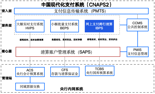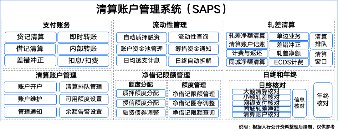 3)内部核算系统:SAPS内部有ACS(央行会计核算系统)、TCBS(央行国库核算系统)这样的系统负责核算,以及CFS(备付金与清算保证金系统)用来管理机构保证金。