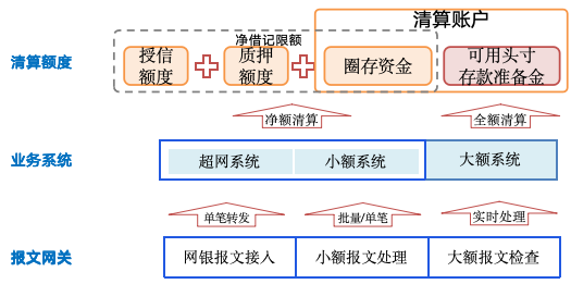 清算账户上存放三部分资金“存款准备金、可用头寸、圈存资金”,其中大额系统独占了其中的“可用头寸和存款准备金”用来进行清算。而小额与超网则是共享“净借记限额”。