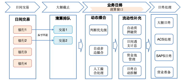 日终在系统业务截止后,如果当天有清算排队的业务,就会开启清算窗口,对2家以上的排队交易进行动态撮合“将多个参与者的资金缺口和冗余头寸按照业务优先级进行交叉匹配,不足缺口完成资金清算”。个别撮合交易允许人工进行撮合干预。