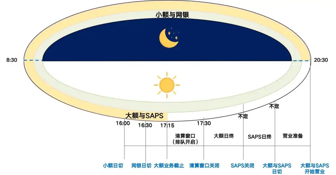 大额支付系统和SAPS每天工作21小时,从早上8:30一直到16:00做结业准备(小额和超网日切),17:15点后停止处理大额业务,并开始进行当天的清算和日终处理。晚上8:30到次日早晨,系统会继续运行夜班。