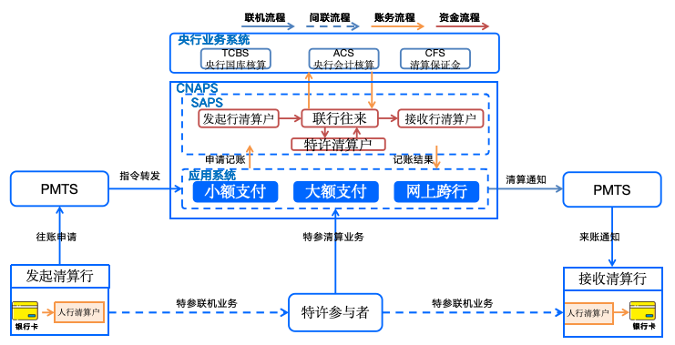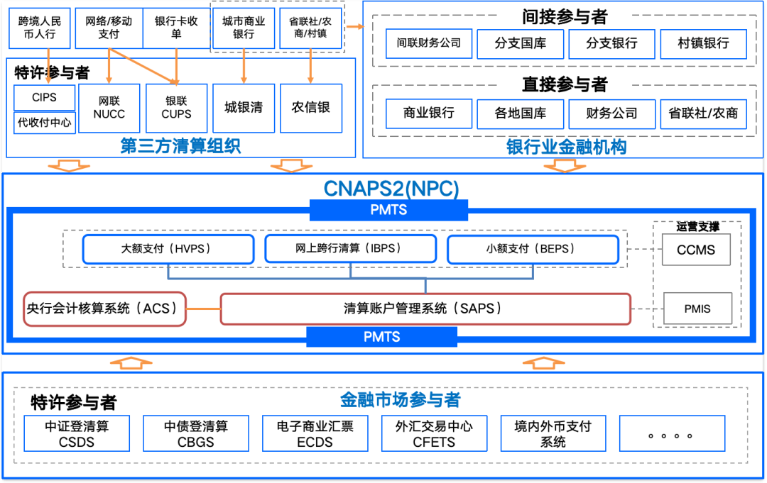 3)多特许参与者:负责处理全国的跨行资金清算,显然压力太大了。并且有银行、国库、三方、跨境、各地城商、农商、金融市场等,因此引入了大量的参与者来服务中国经济的方方面面。