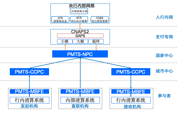 2)一套清算网络:即PMTS,它负责全国清算网络报文的传输,包括国家处理中心(NPC)、32个城市处理中心(CCPS)以及参与者内部的网络客户端。