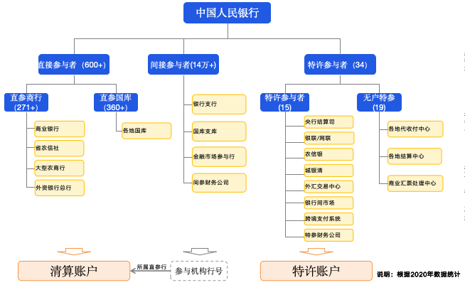 直接参者多是在人行开设清算账户的,这里包括人行、商业银行、国库的总部,它们可以直接通过人行账户清算。