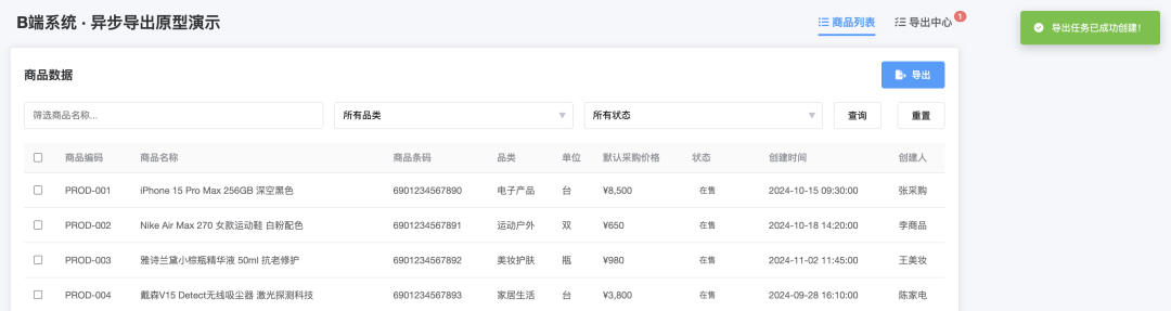前端系统迅速捕获此请求,弹出一个简洁的提示框:“您的导出任务已提交成功,任务ID:[EX123456],请前往导出任务中心查看。”此时,用户界面已完全恢复可操作状态。