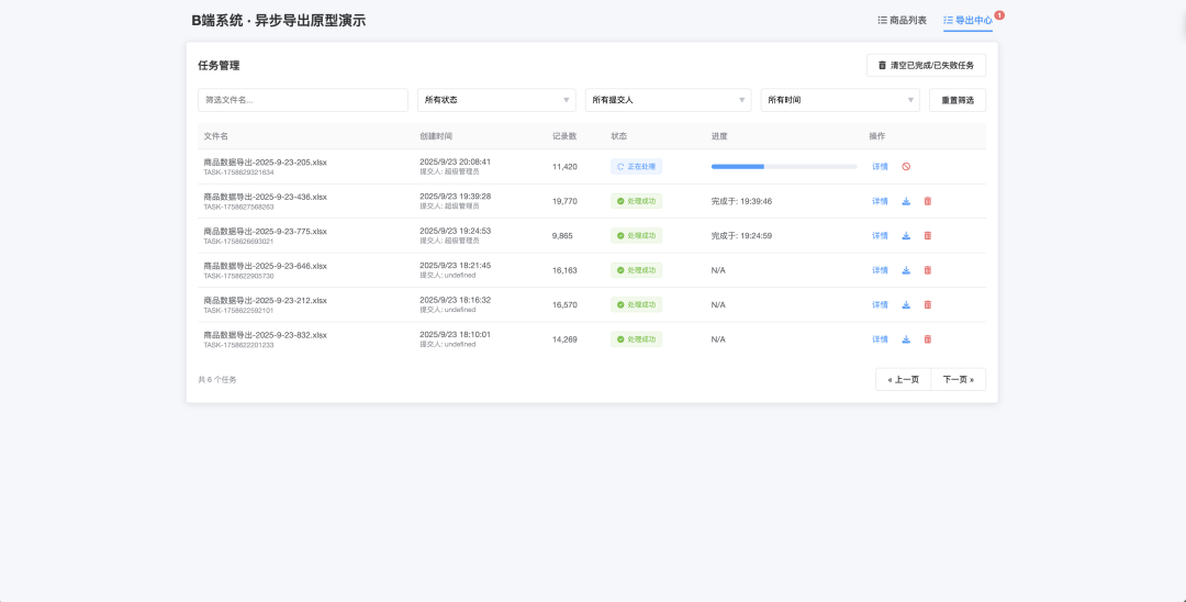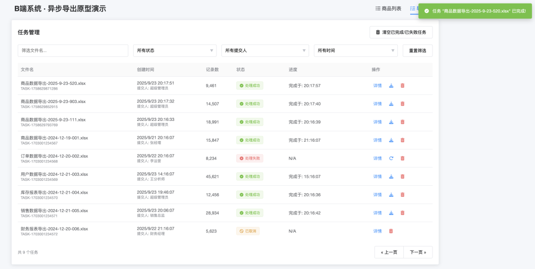 对于“已完成”的任务,用户点击“下载”按钮,系统会直接从“文件仓库”中取出预先生成好的文件,提供给用户下载。用户不再需要等待后端临时生成文件。