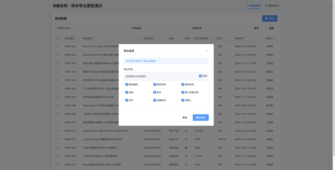 用户在界面上(例如商品列表页)配置导出字段和筛选条件,点击“确认导出”。