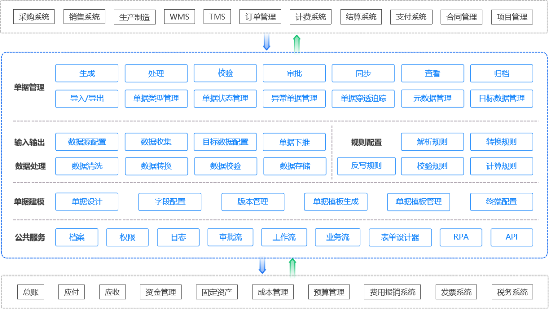 单据管理层:是核心业务层,具备生成、处理、校验、审批、同步、查看、归档单据等功能,还能进行导入/导出、单据类型管理、单据状态管理、异常单据管理、单据穿透追踪、元数据管理、目标数据管理,对单据全生命周期进行管控。