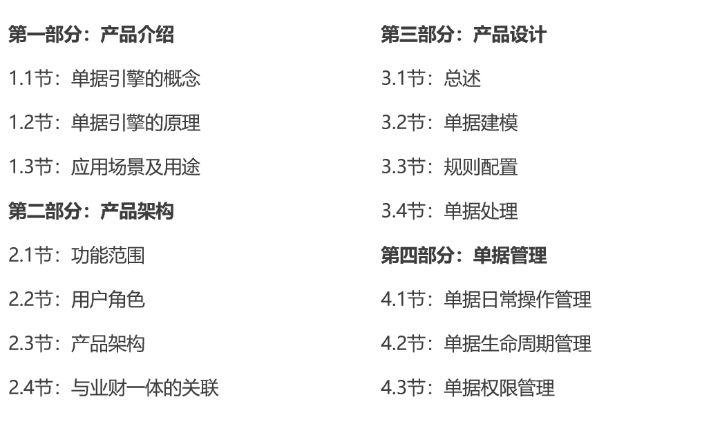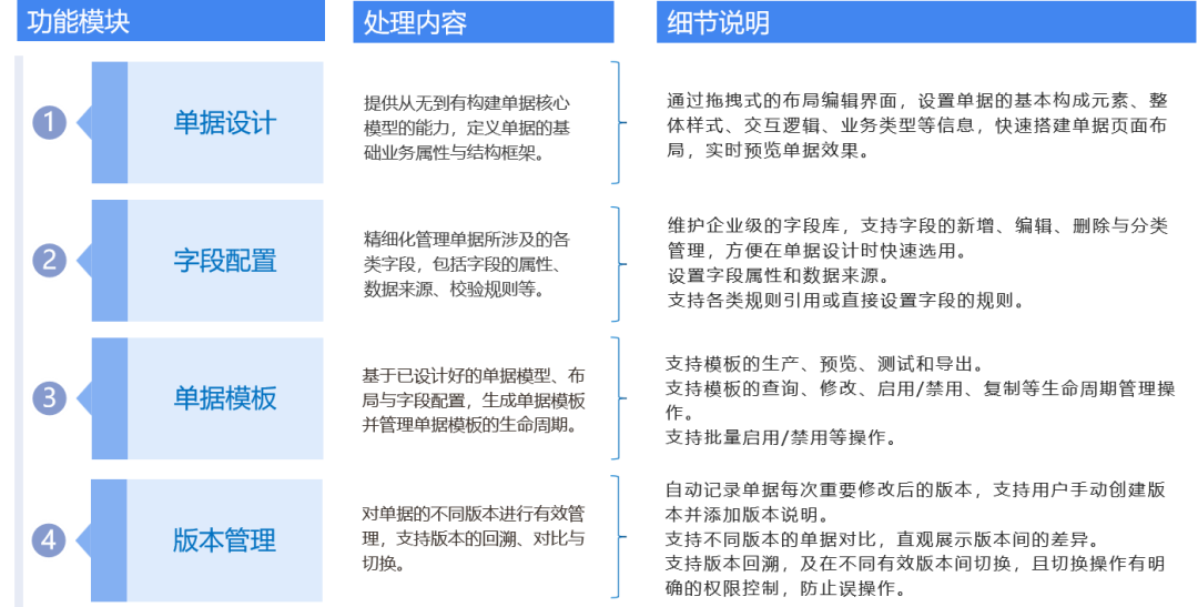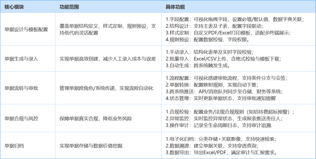 结合企业不同业务场景高效运转时对单据引擎的实际需求,我们可以将单据引擎的功能范围规划为以下内容: