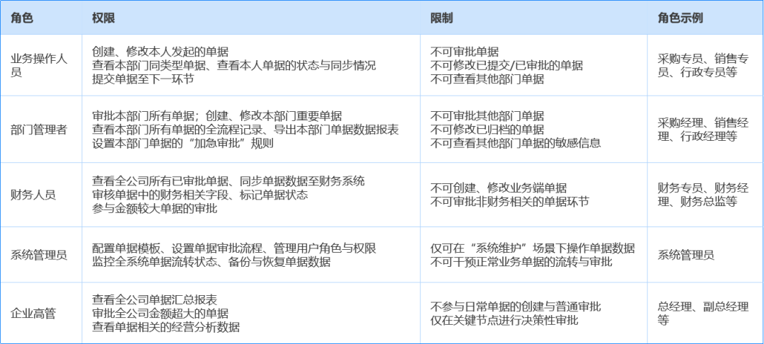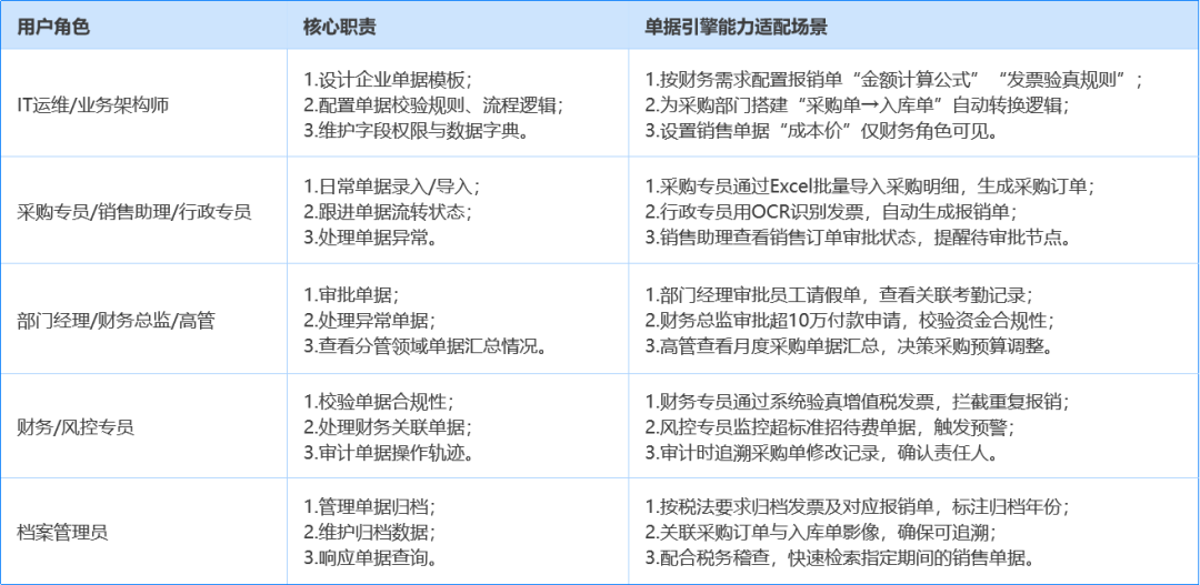 单据引擎服务于企业内多种用户角色,不同角色有各自适配场景: