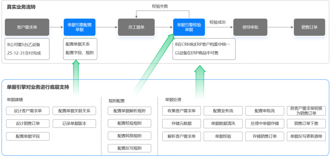 单据引擎对业务的底层支持主要通过单据建模、规则配置、单据处理这三大模块来实现,全方位保障业务流转的高效与精准。