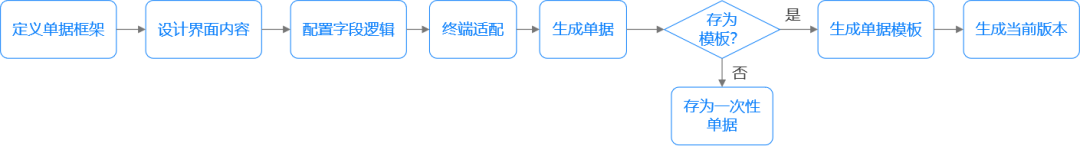 首先定义单据框架,搭建单据的基本结构;接着设计界面内容,确定单据呈现的界面元素与布局;然后配置字段逻辑,设定单据各字段的关联、计算等逻辑规则;之后开展终端适配,确保单据能在不同终端正常显示与操作;完成适配后生成单据。