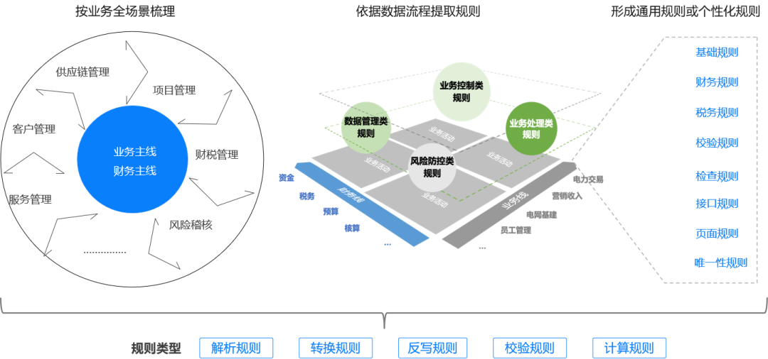 首先围绕企业的业财主线,将相关业务场景深度挖掘,然后根据接着依据数据流程提取规则,从资金、税务、预算、核算等数据流程,以及相关业务线的业务活动,提取出业务层规则,比如财务规则、税务规则等,这个阶段,不用对抽象性做过强要求,符合业务逻辑即可。