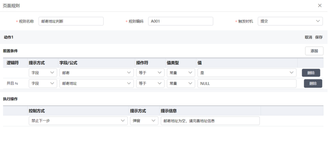 校验规则:添加校验规则的触发条件、校验内容、控制方式及触发校验后的提示语,系统内置校验逻辑并在满足条件时自动触发。