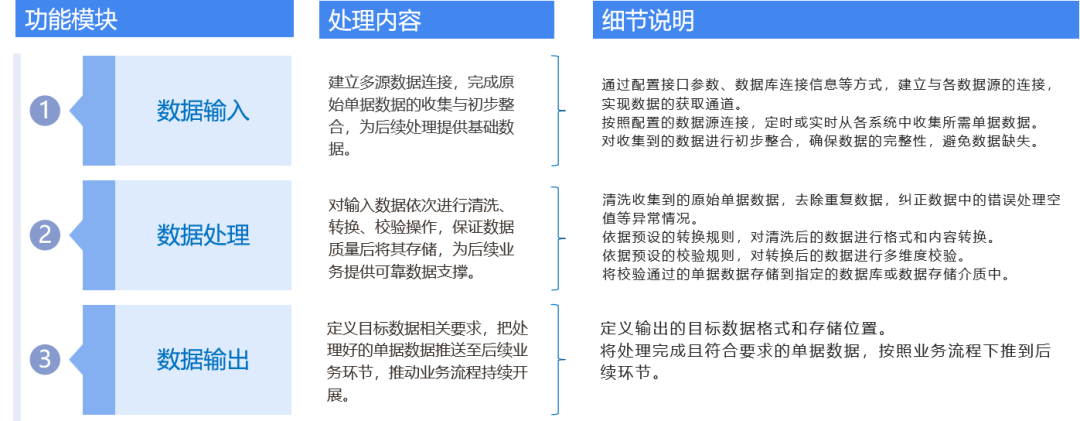 单据处理主要通过数据输入、数据处理、数据输出三大功能模块实现,保障单据数据从收集到应用的全流程高效且可靠。