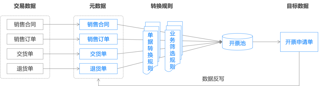 系统执行单据处理逻辑时,如下图所示,将以真实业务数据为基础,通过多种方式获取原始数据,将元数据分类存储。之后根据提前配置好的各类规则进行单据处理,比如通过单据转换规则,将交易类单据转换成开票单据等。同时存储目标单据,以备后用。当目标单据业务处理完成后,如果需要,可以根据反写规则,将相关数据反写给元数据,确保数据的一致性和业务流程的闭环。