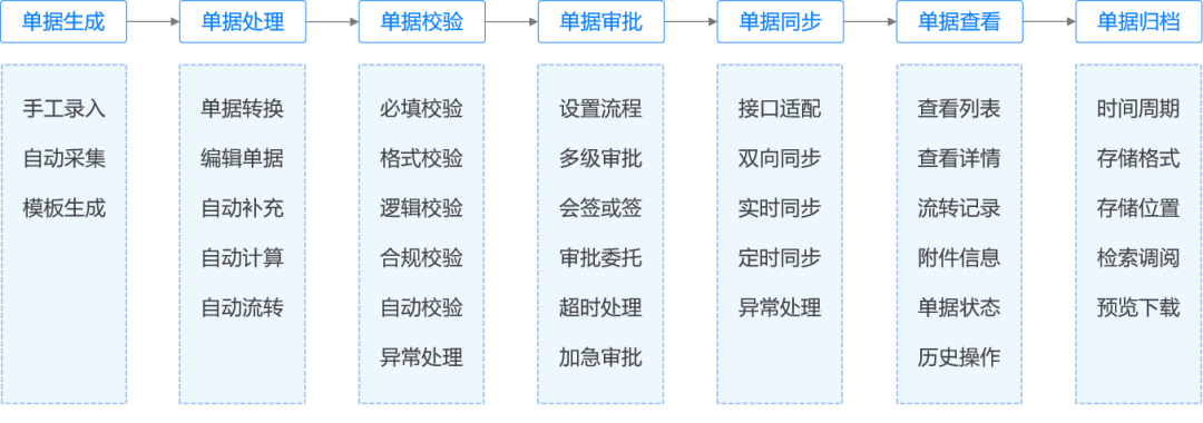 - 单据校验:开展必填校验、格式校验、逻辑校验、合规校验等多维度校验,同时支持自动校验与异常处理,保障单据数据的准确性与合规性。