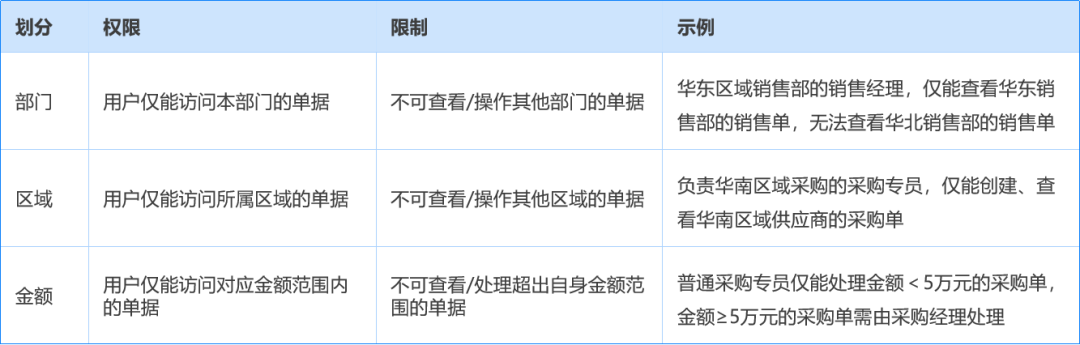 基于最小权限原则,通过角色权限与数据权限双重控制,确保单据数据安全,防止未授权访问与操作;做到同一张单据在不同人眼里不一样,且全程可审计、可回溯、可灰度。其中,按数据权限划分示例如下:
