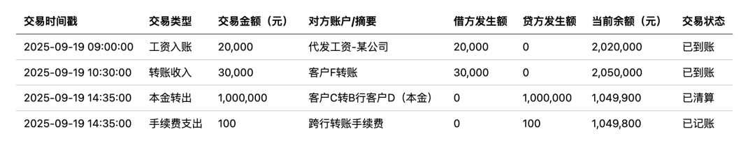 客户C(A银行对公客户,账号:11010000000001)于2025年9月19日14:30通过A银行网银向客户D(B银行对公客户,账号:22010000000001)转账100万元,A银行收取100元手续费(合计扣款1,000,100元),通过大额支付系统完成清算