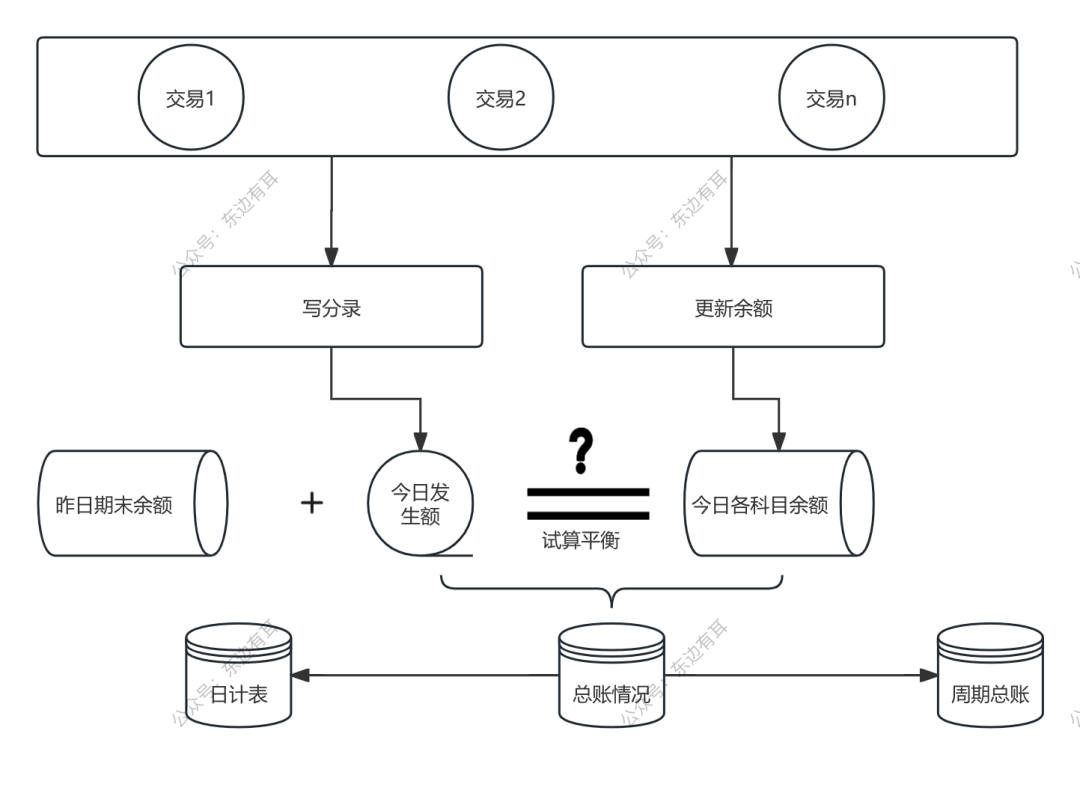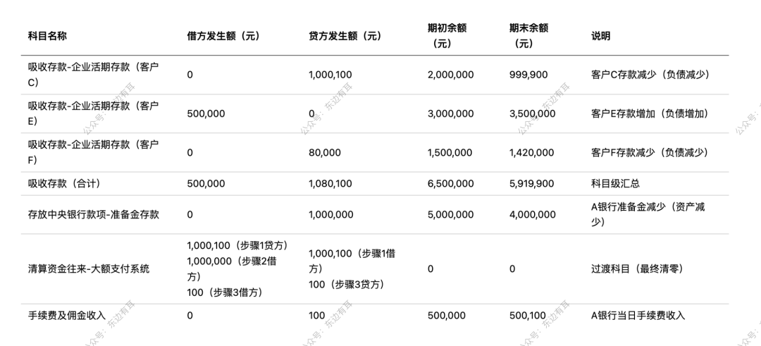 上面提到过,银行整体的财务快照,提供科目级别的汇总数据(如当日客户存款减少多少、手续费收入多少),用于编制财务报表(如资产负债表、利润表)