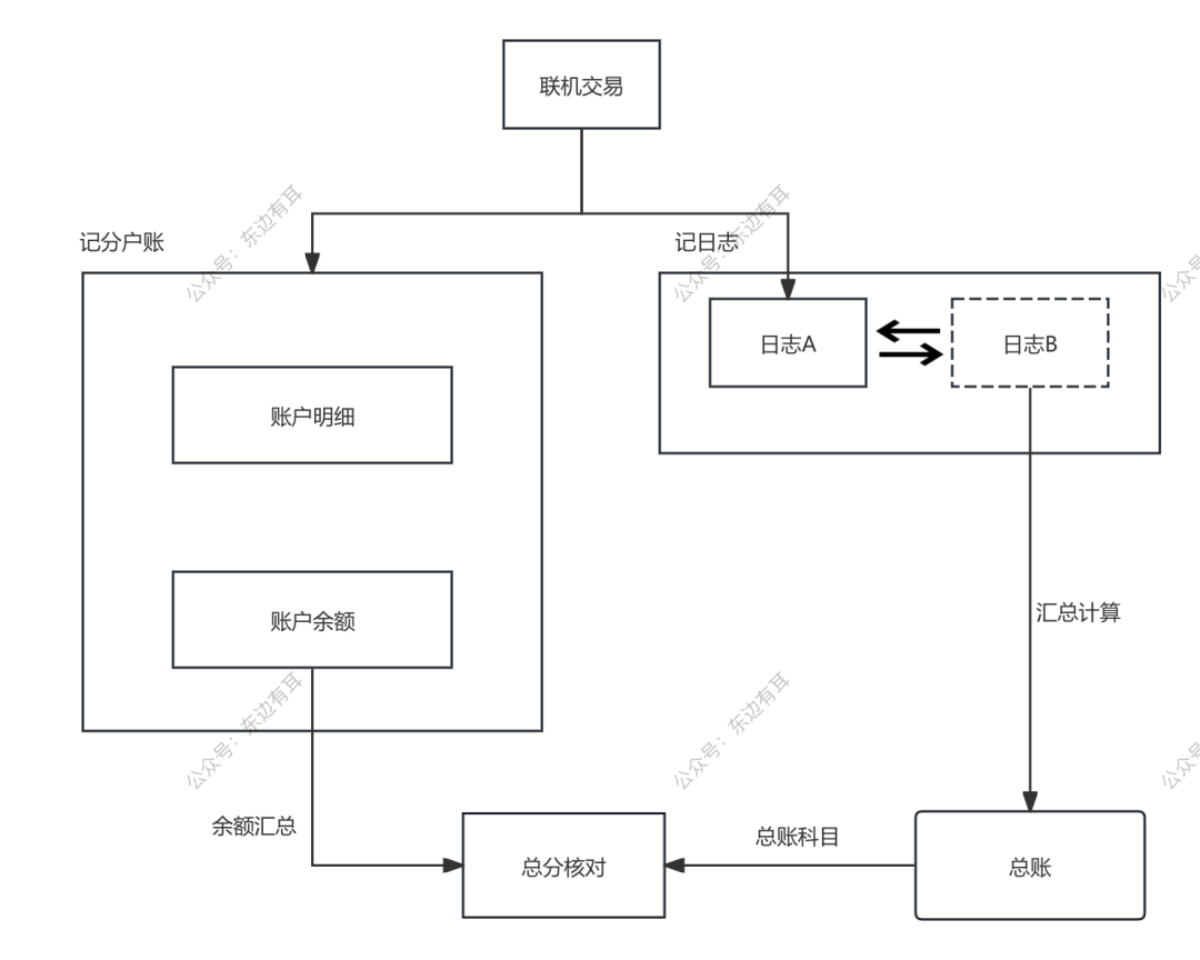 图中的日志A和日志B的设计,叫做双日志设计,实线是当前在用的日志,虚线是昨日日志,日终切换。有疑问吧?核对什么呢?这不是肯定是平的吗!是的,理论上,这个是平账的,但是也会有不平的情况,一是系统不可控原因导致的不平,二是人为故意的不平(试想:操作数据库给加一笔钱,太可怕了)