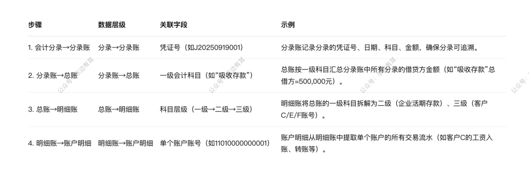 单笔交易从会计分录开始,逐步汇总到分录账、总账、明细账,最终细化为单个账户的流水,形成“数据金字塔”