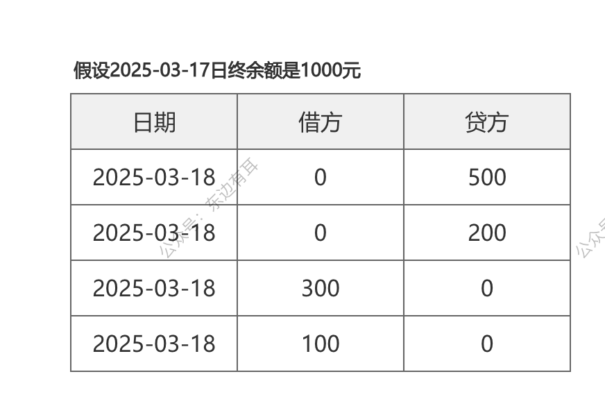 根据上述信息,那么在2025-03-18日的余额为:上日余额+今日贷方发生额-今日借方发生额=今日余额,即:1000+500+200-300-100=1300