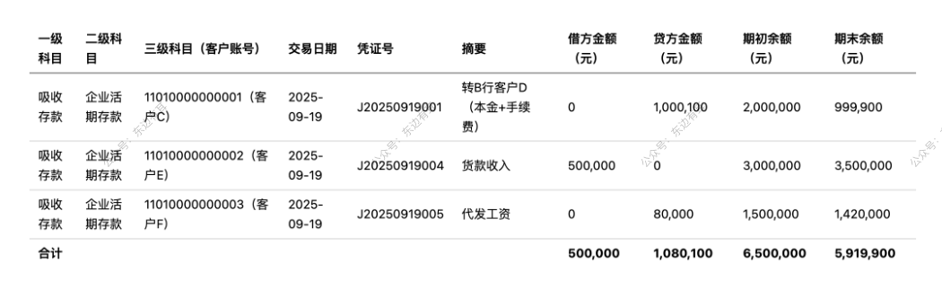 - 明细账中吸收存款科目的借方合计500,000元(仅客户E的收入),贷方合计1,080,100元(客户C转出1,000,100元+客户F支出80,000元),与总账吸收存款的发生额完全一致。