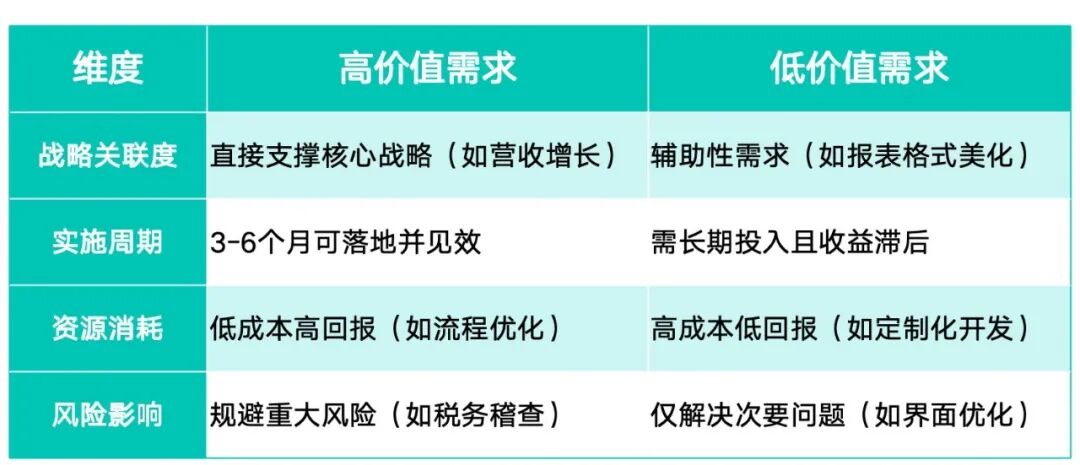 战略关联度:“如果我们实现了这个需求,它能多大地帮助财务部门更好地支持公司的战略目标?比如降低成本、控制风险,或是赋能业务增长?” 我们可以一起为此打分,5分代表至关重要,1分代表锦上添花。