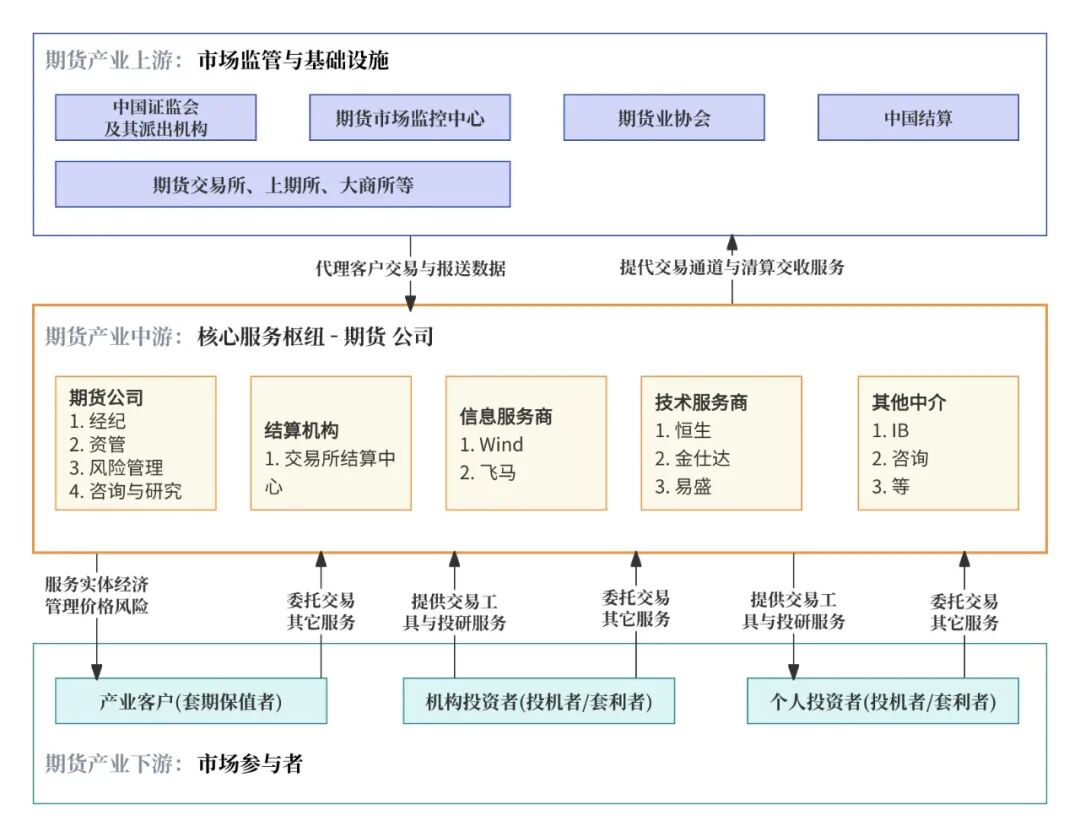 中心枢纽:期货公司处于整个期货行业的 “市场中介与服务层”即中层。方便大家更直观地理解,围炉特绘制了下面的期货产业链全景图,它清晰地展示了期货公司的核心定位,如下图所示。