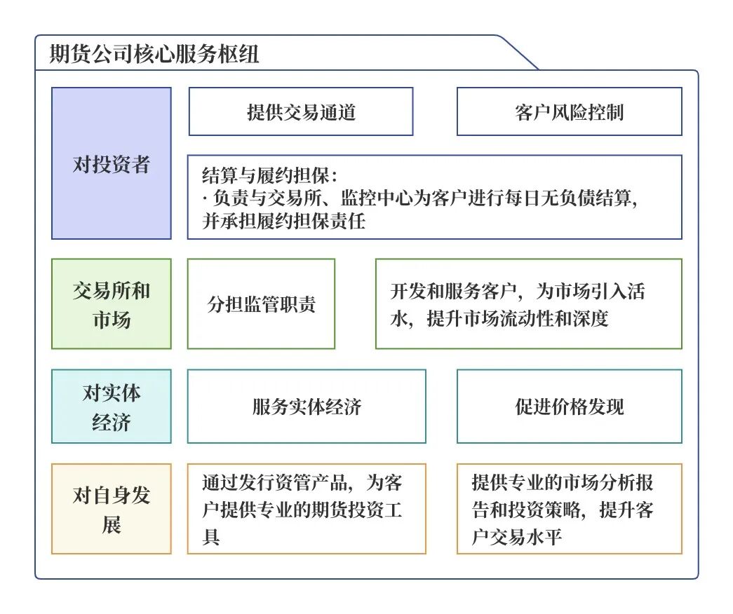 2、核心服务枢纽:通过期货产业链全景图,我们可以清晰了解期货公司承担职责简单概括起来:连接监管与市场参与者,提供交易、结算、信息服务,具体如下图所示:
