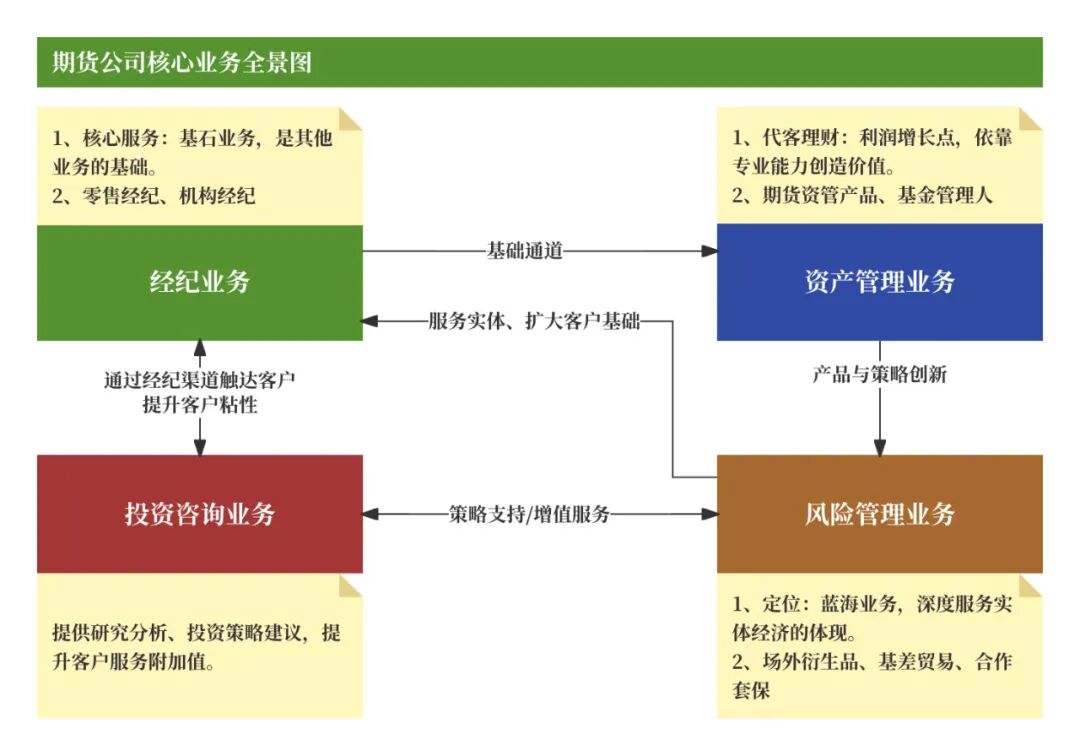 好了,我们回到期货公司核心业务上来,按围炉的国际惯例,让我们从一张期货公司核心业务全景图开始,如下图所示。